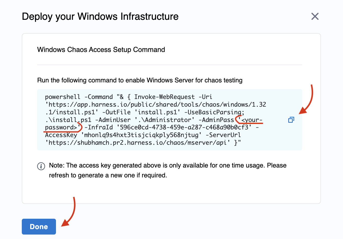 1. Copy the command generated. The prerequisites discusses how you can configure a password. If you have a password, replace it in the <your-password> placeholder. Execute this command on your terminal (remember to open the command prompt as an admin if you are not an admin by default). Click Done once you finish the execution.