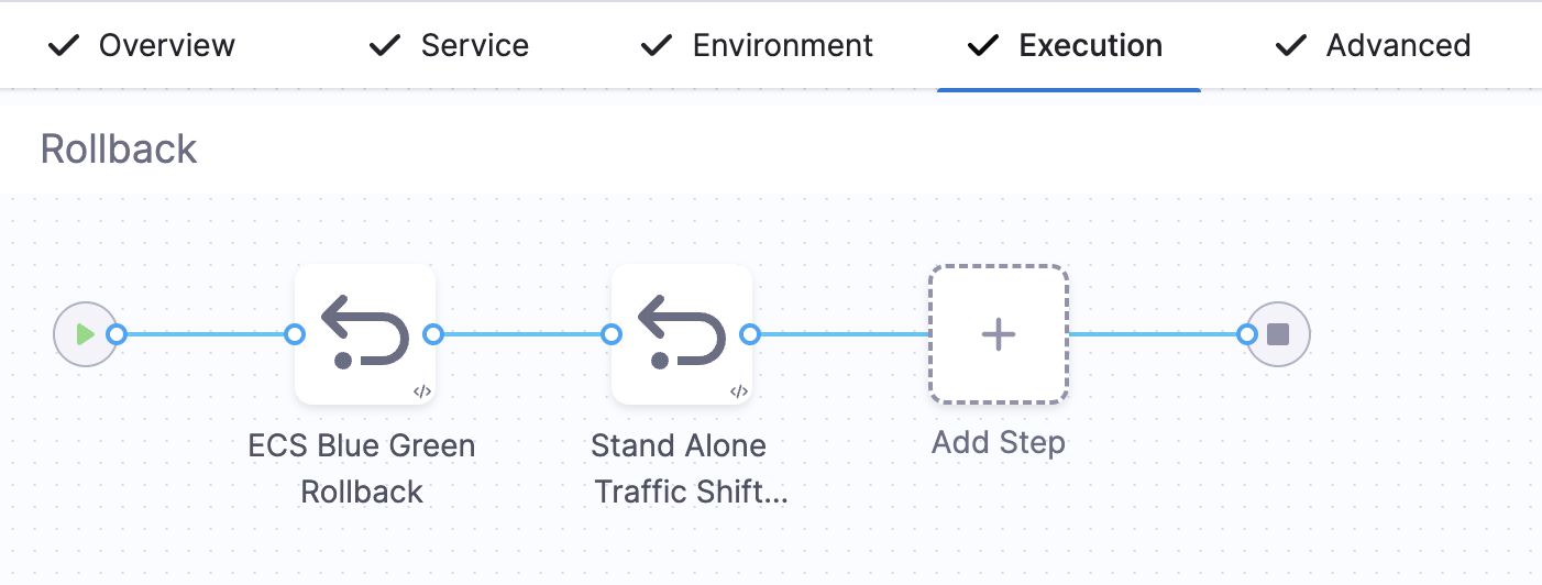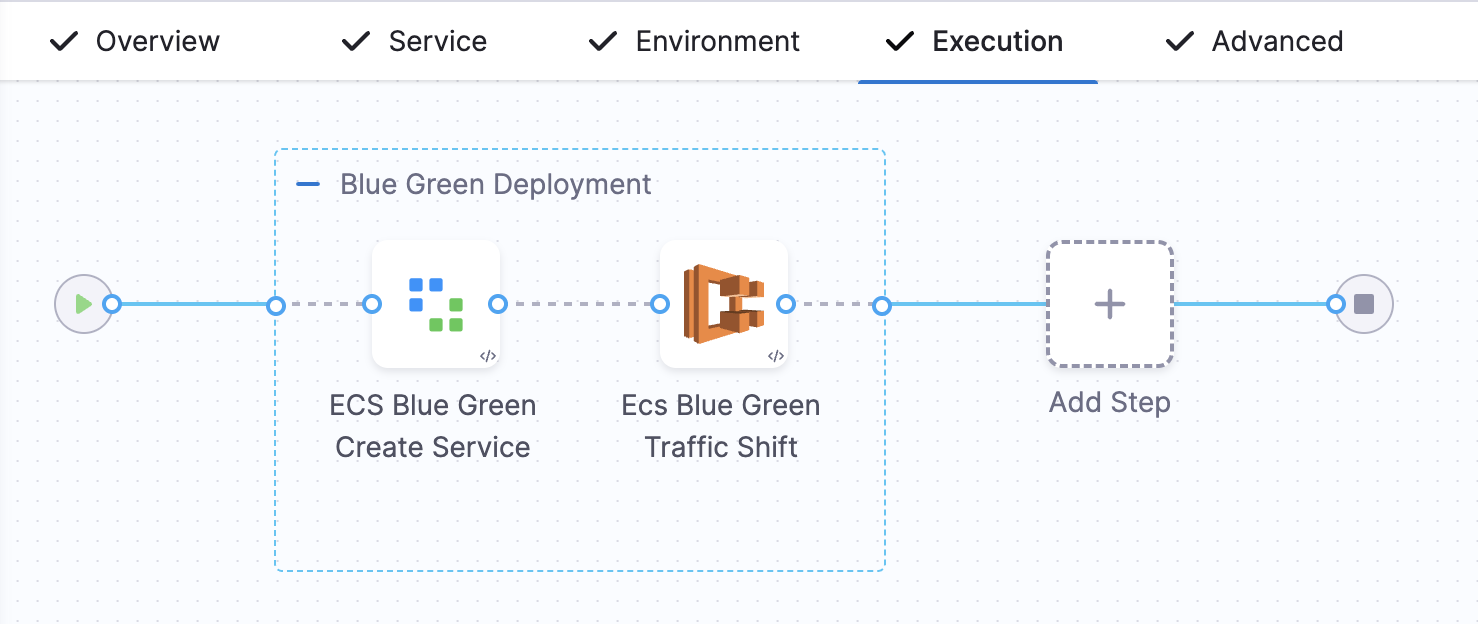 If you do not select the Add Traffic Shifting Steps checkbox, then you will have a Blue Green Deployment step group with steps Configure Blue Green Deployment and ECS Blue Green Swap Target Groups.