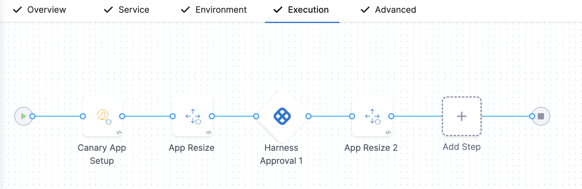 The canary deployment contains Canary App Setup and App Resize steps. You can add more App Resize steps to perform gradual deployment.