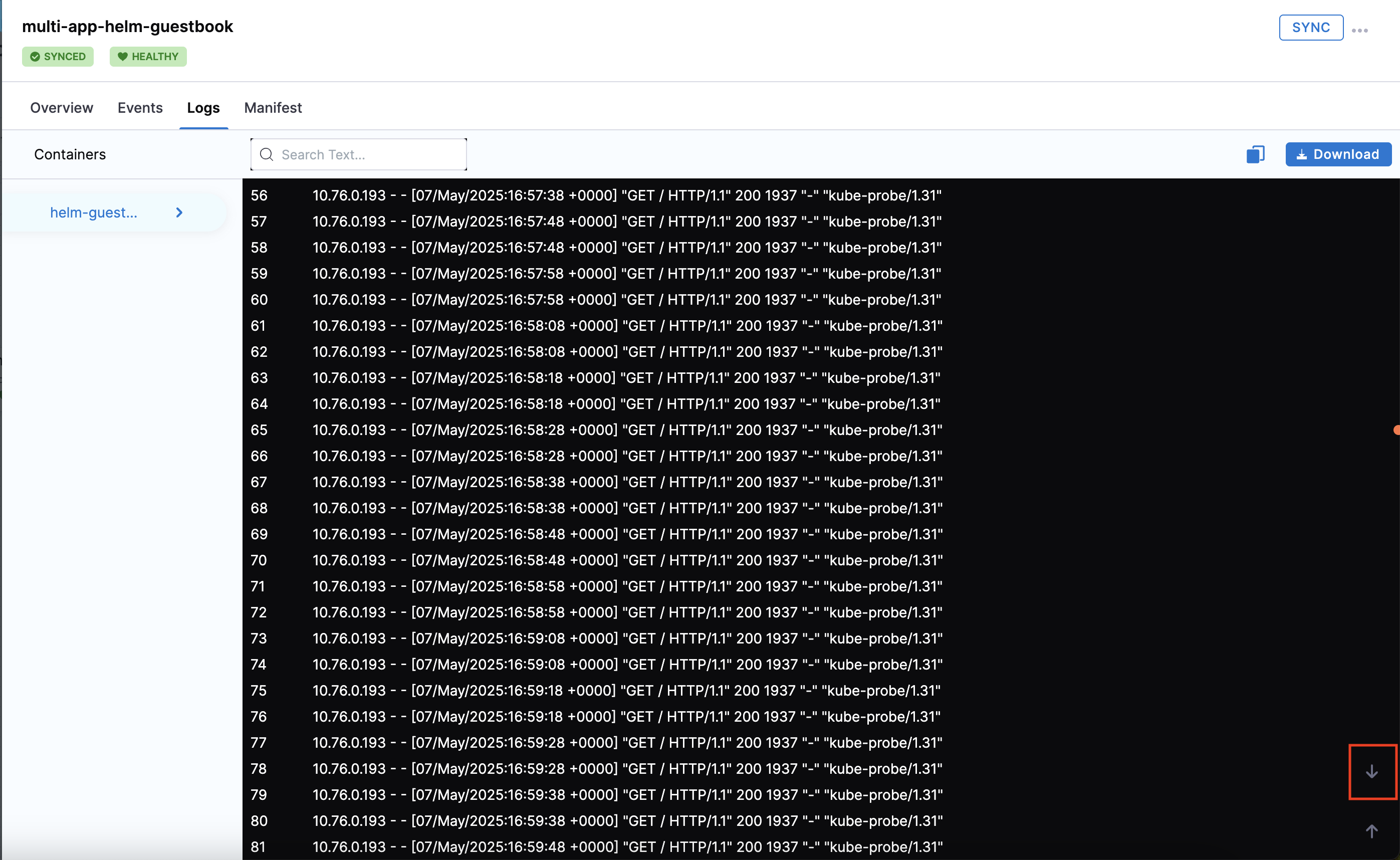 • Logs: The logs of the resource. These logs are searchable, copyable, and downloadable. You can also view the log tail by clicking on the down arrow in the bottom right corner (click image below).