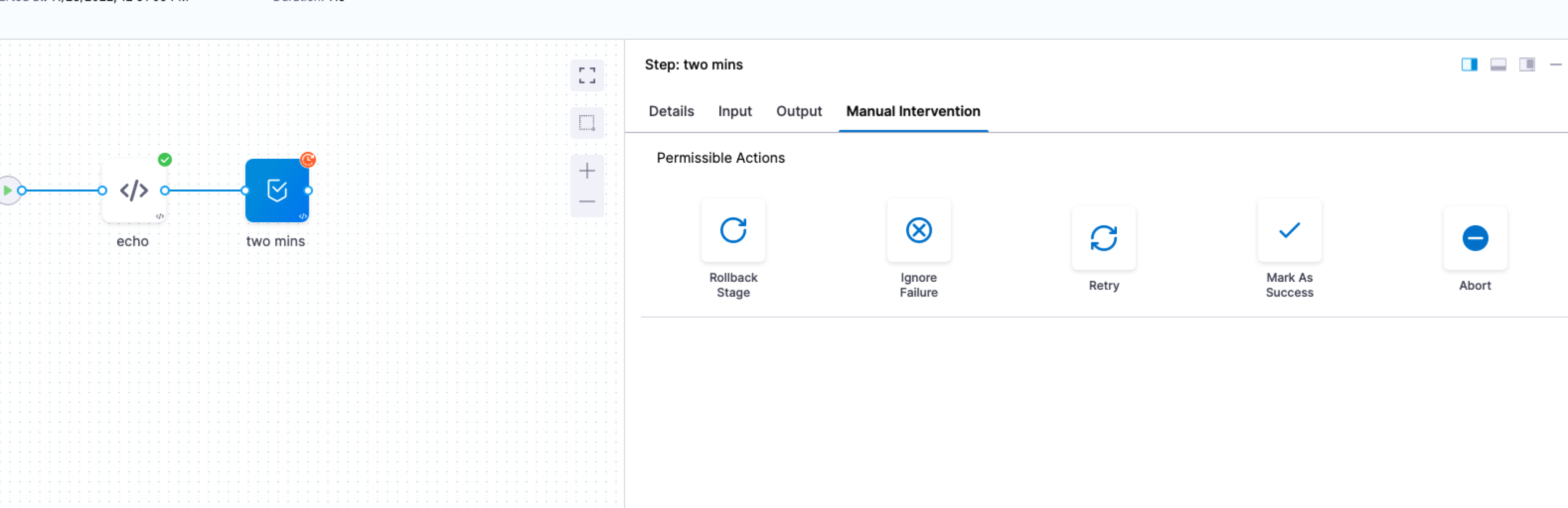 For example, let's say a Wait step has the failure strategy Manual Intervention. When the user selects Mark as Failed, they are prompted with the Manual Intervention options: