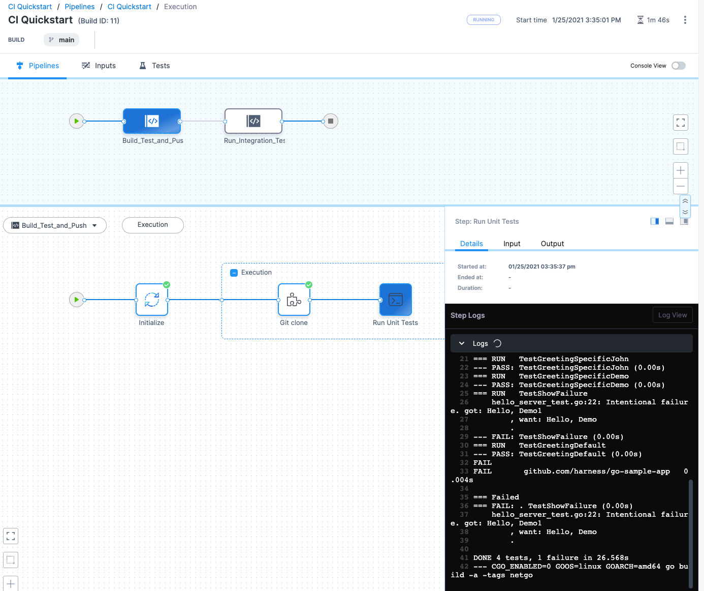 To run unit tests in a CI pipeline, you can use either a Run step or a Test step. This tutorial uses a Run step. In addition to unit tests, the Run step can run any number of commands on a container image. Run steps are highly versatile and you'll use them often in your CI pipelines. While not used in this tutorial, with the Test step you can leverage Test Intelligence.