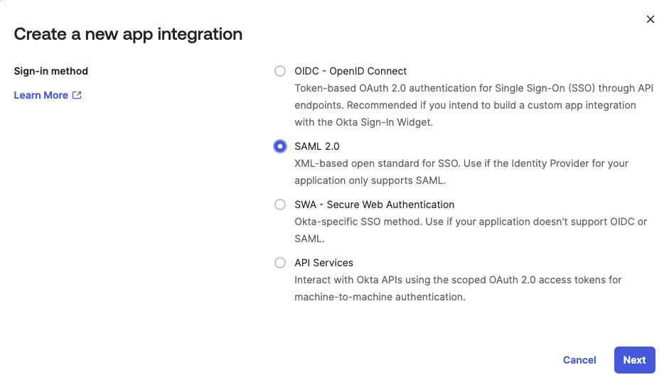 5. Select SAML 2.0, and then click Next.