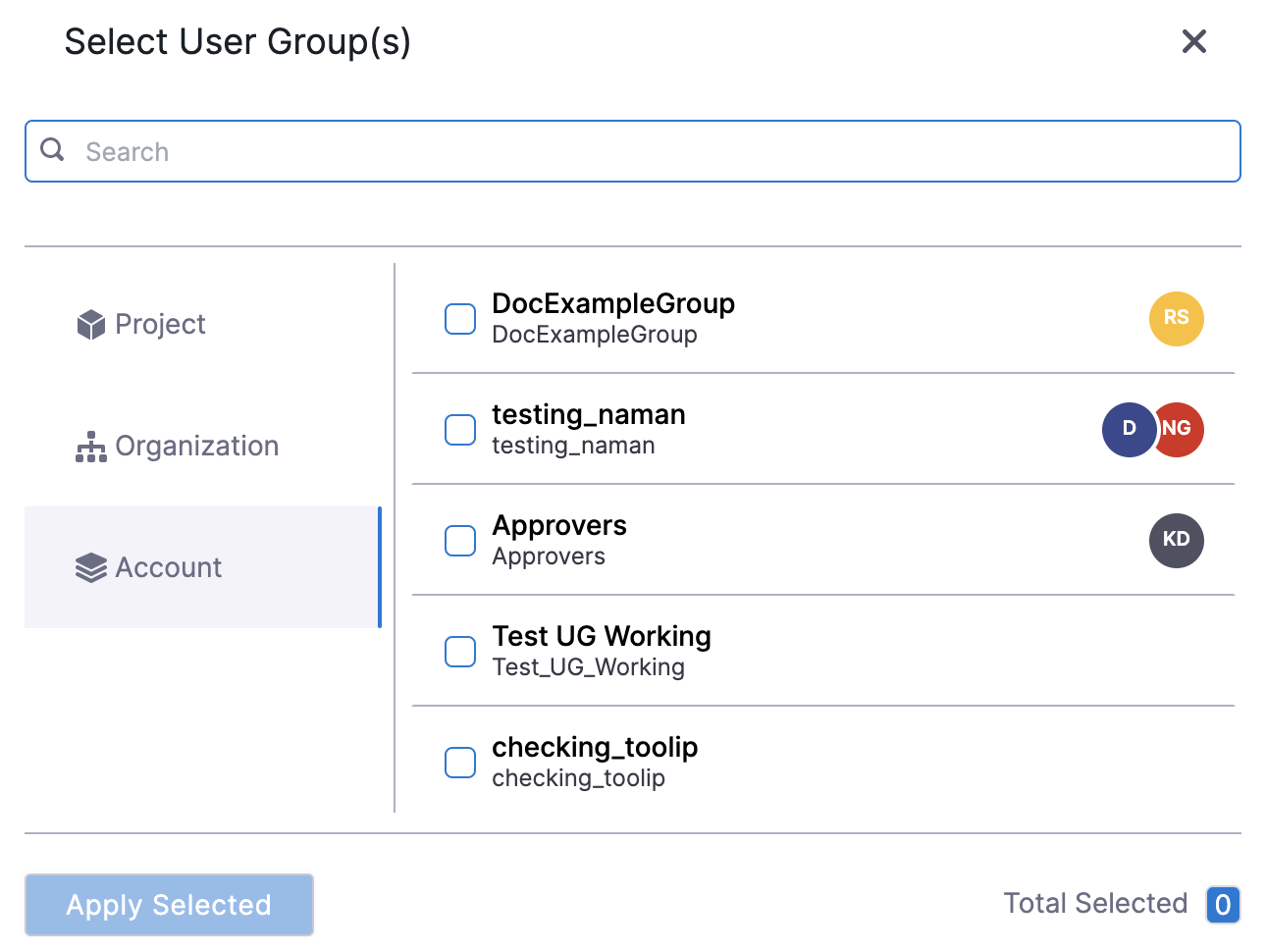 - To create a user group at the organization scope, go to Account Settings, select Organizations, select the relevant organization, and then select Access Control.