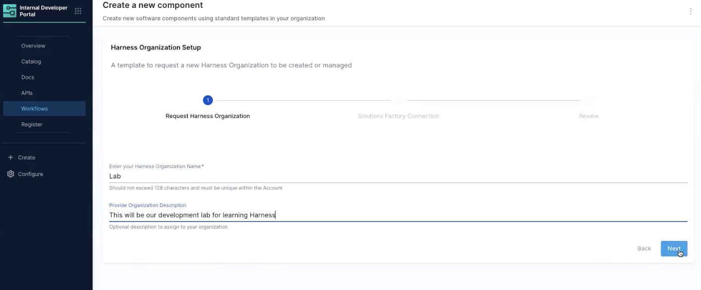1. Go into IDP → Workflows → Execute Harness Project Setup → Select the organization we created, enter name and description → Next → Review → Create