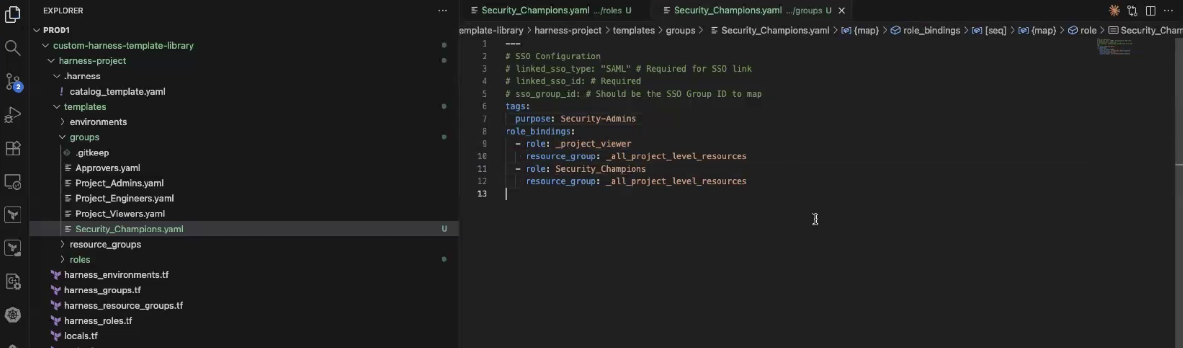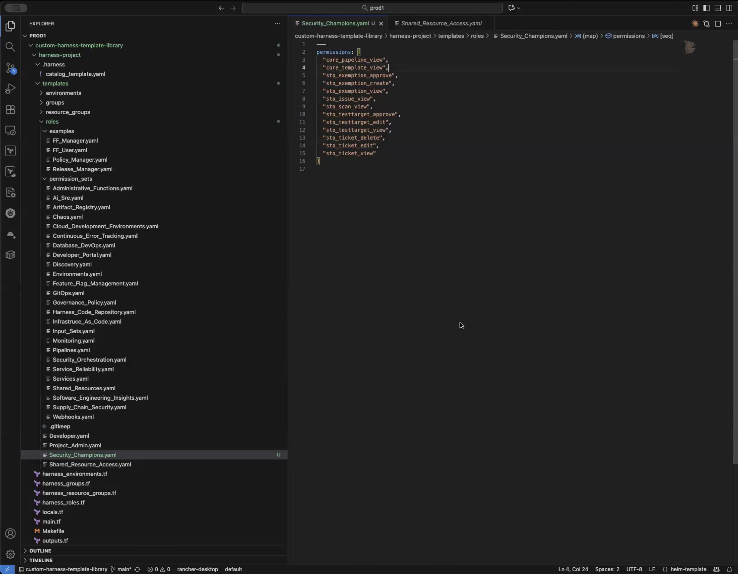 • Go back into custom-harness-template-library and create a new file called Security_Champions.yaml under harness-project/templates/roles that includes what privileges this group should have. Sample permission sets are included under the permission_sets directory. It should look something like this:
