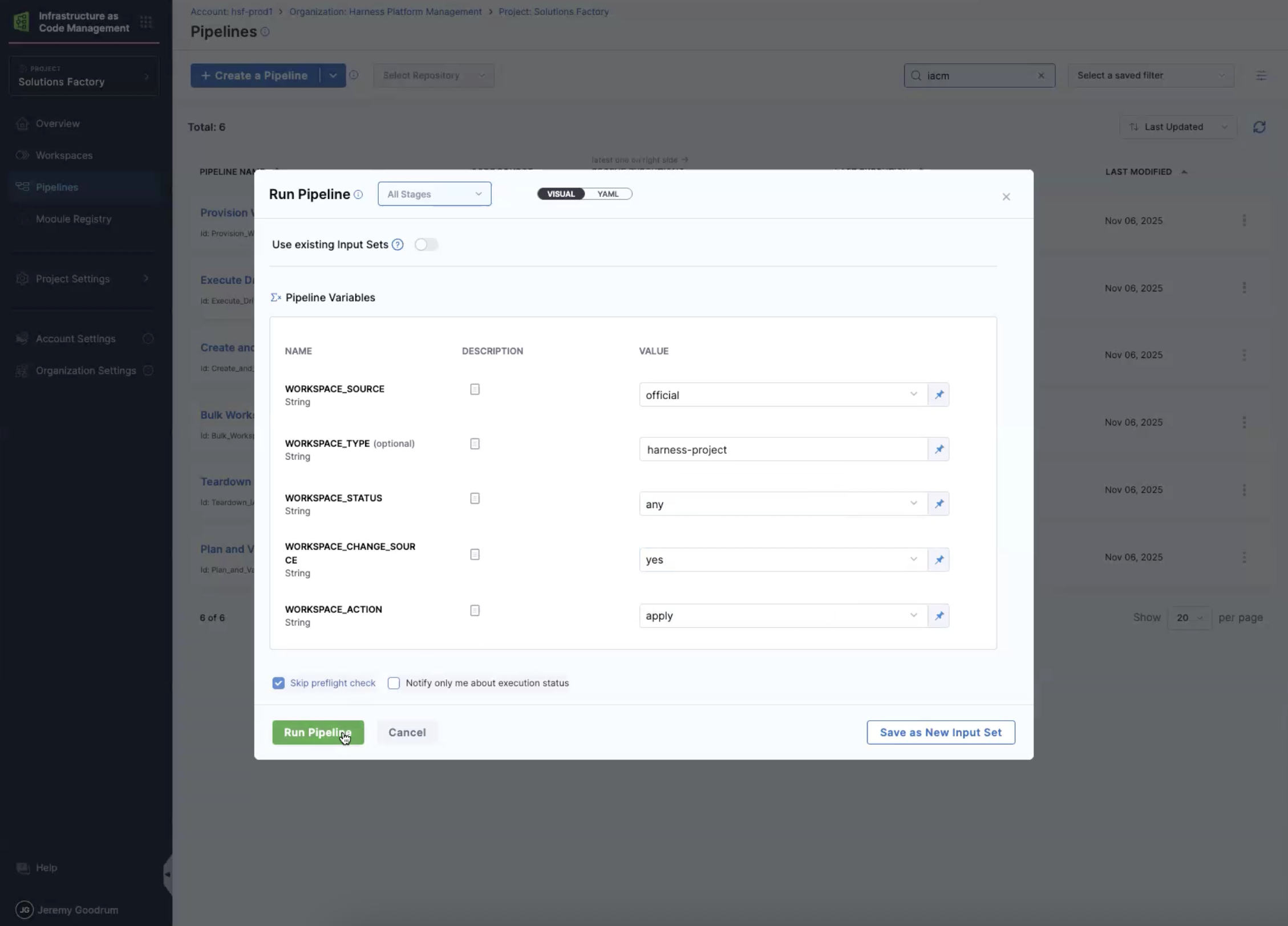 1. For the projects you created before switching over to use the custom-harness-template-library — Go to Pipelines and run Bulk Workspace Management