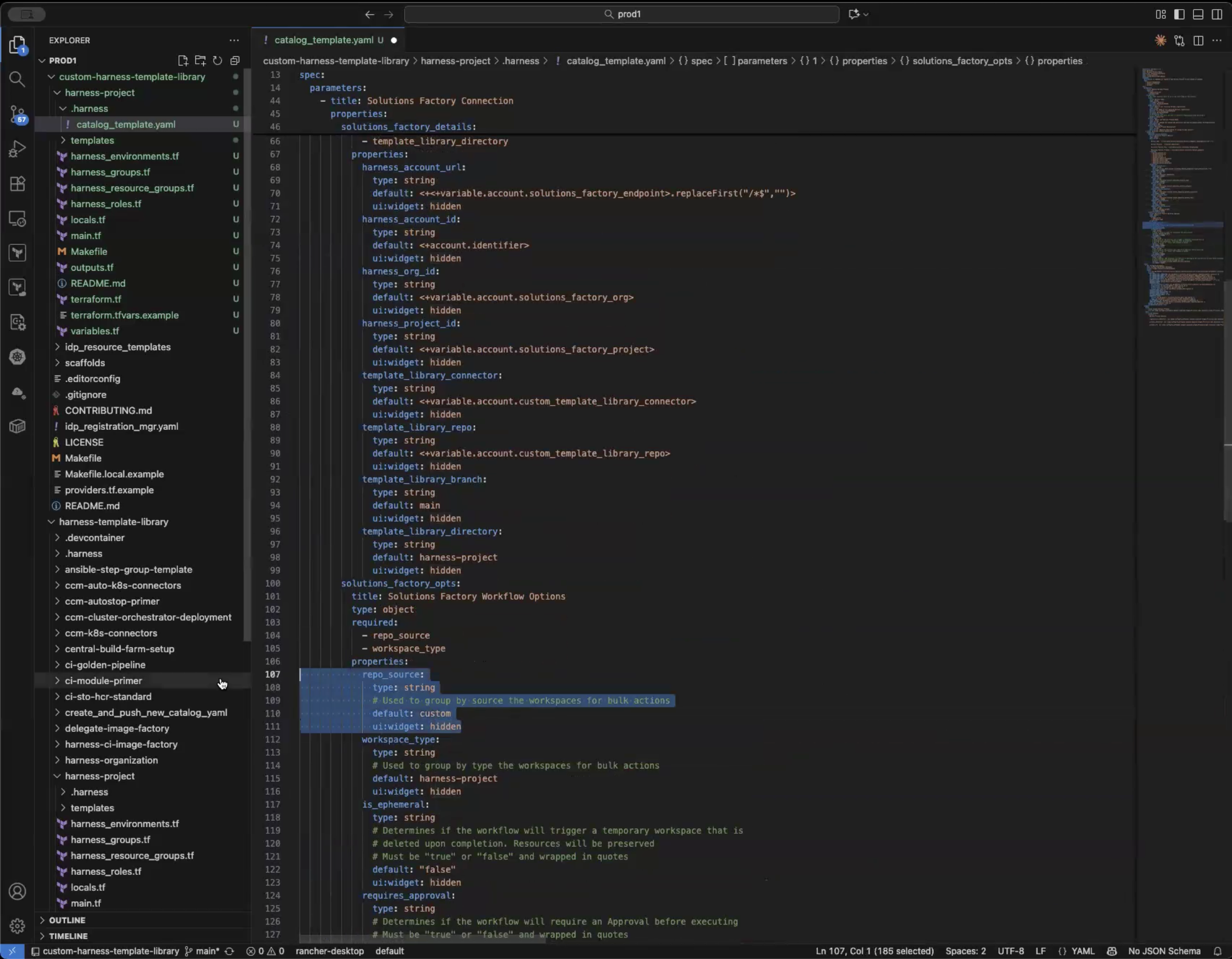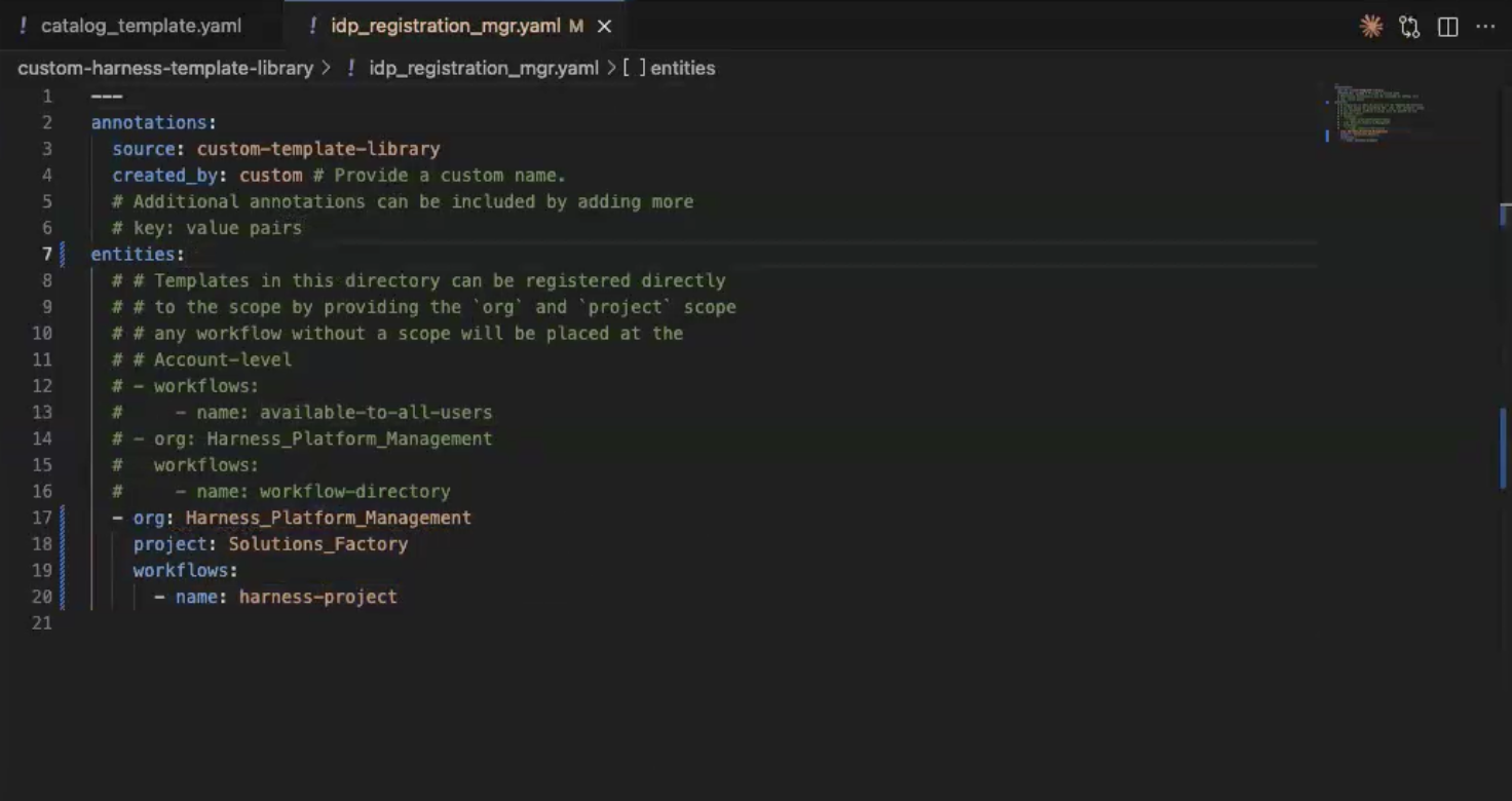 4. In custom-harness-template-library/harness-project/.harness go into catalog_template.yaml and find the properties template_library_connector and template_library_repo and paste in the Ids from above after “variable.account.” It should look like this: