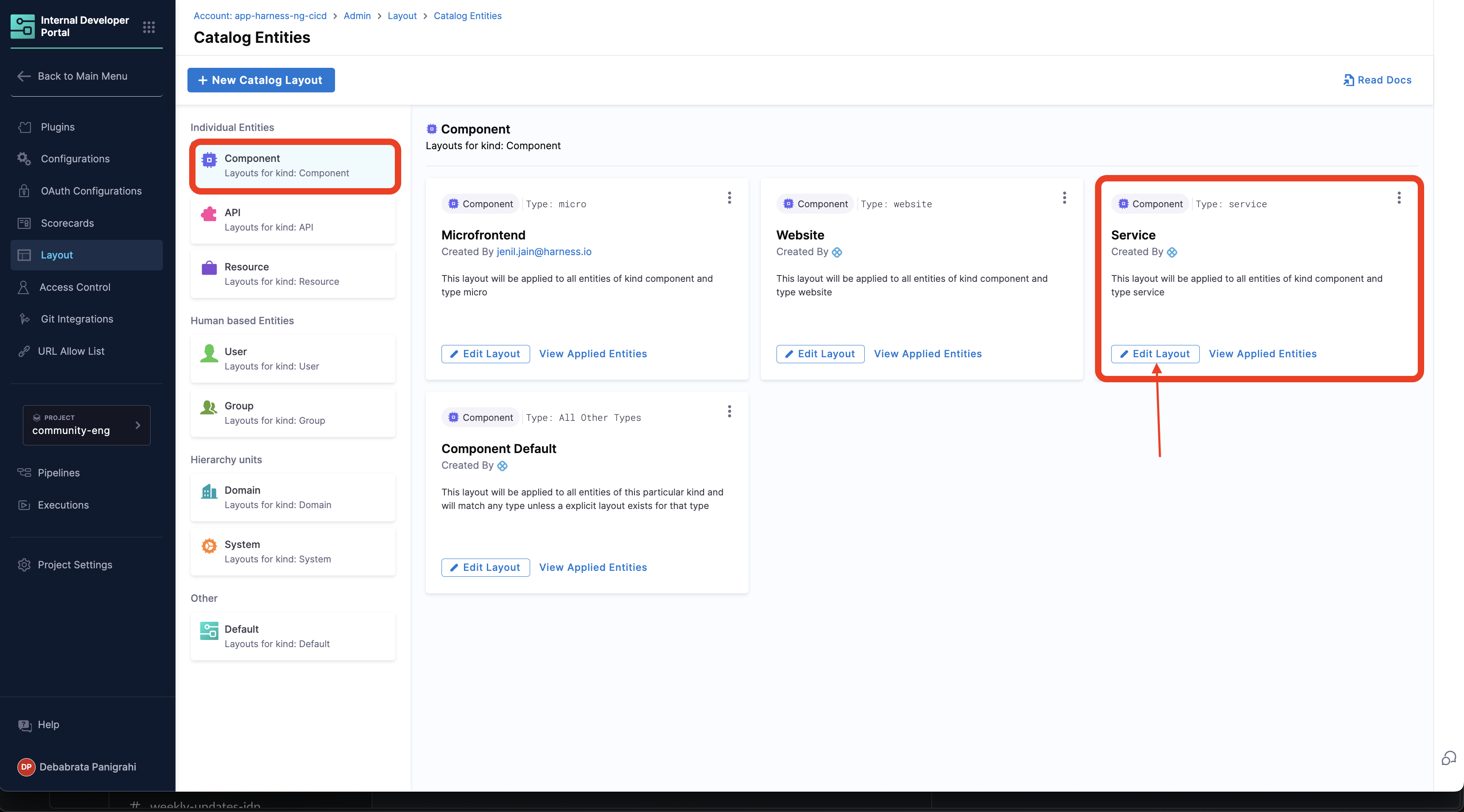 - Go to the Layout Page and under Admin and select Catalog Entities.