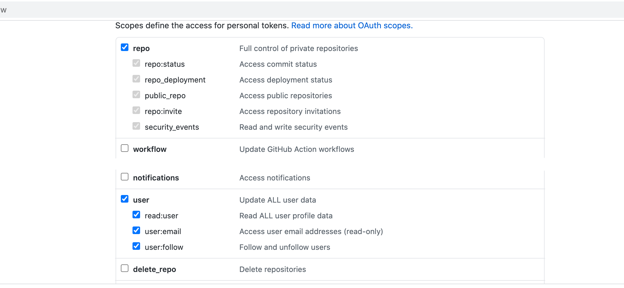 For GitHub, the token must have the following scopes: