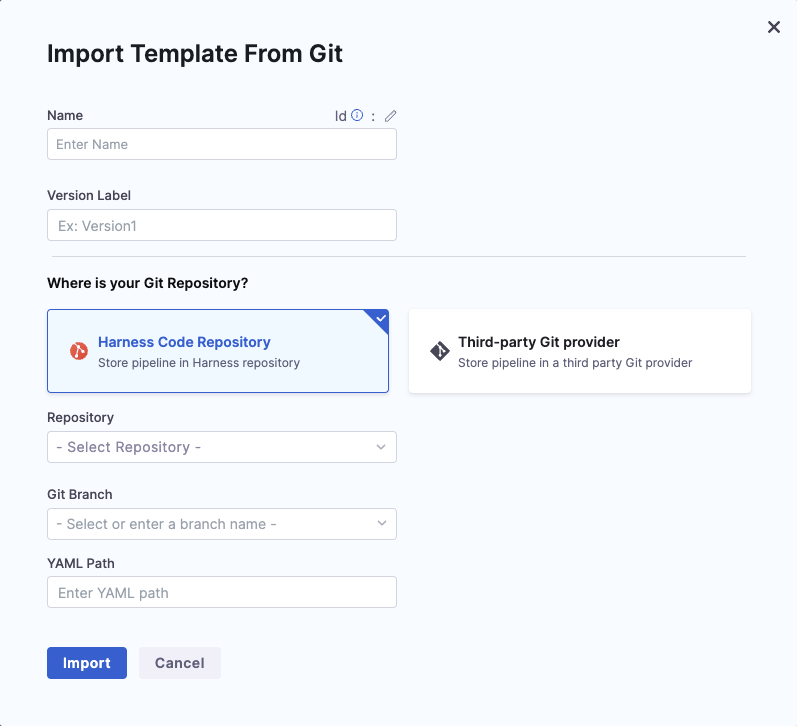 1. Enter the YAML Path from where you want to import the template. All your configurations are stored in Git in the Harness Folder.