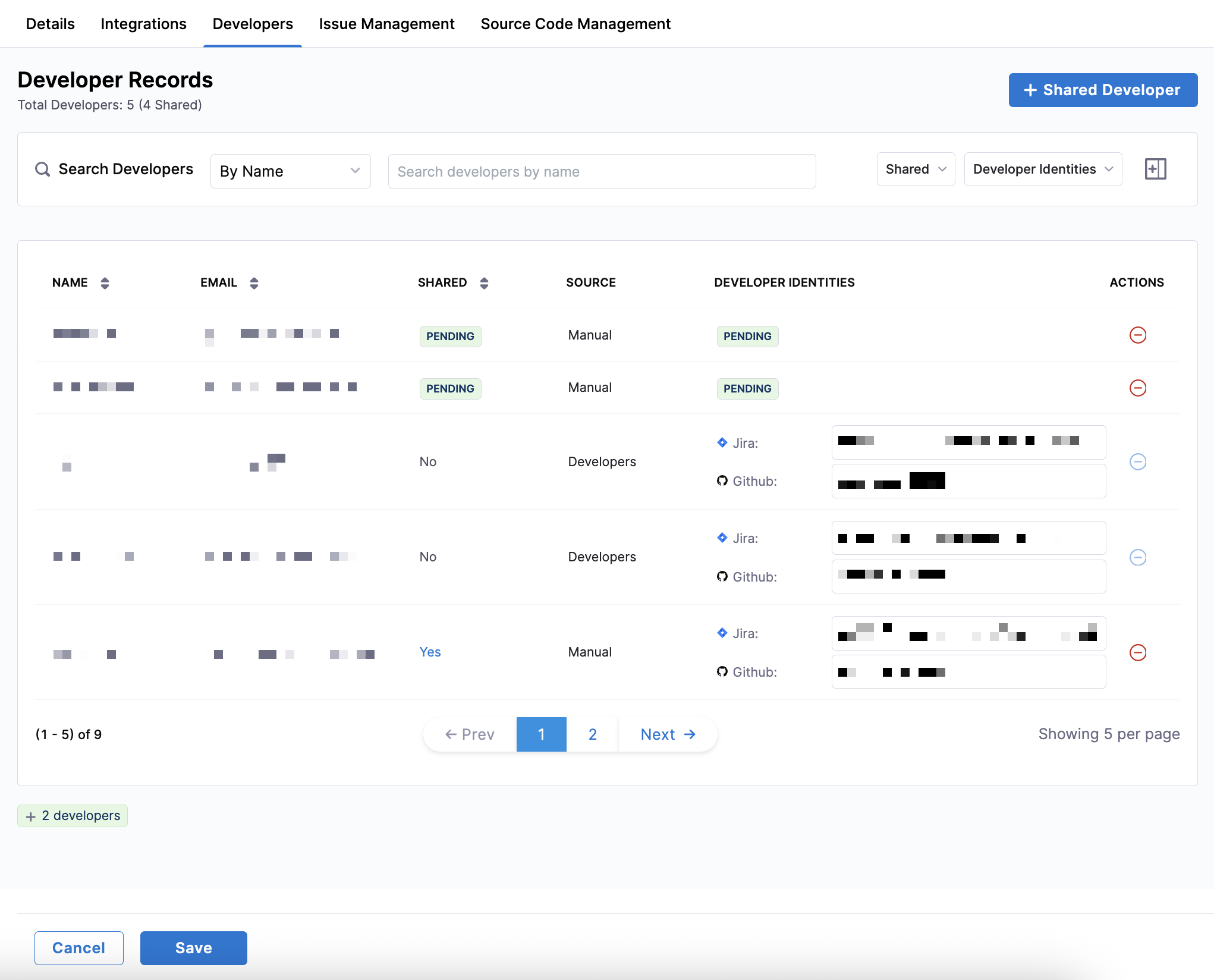 Column Description Name Developer’s full name Email Developer’s email Shared Yes(until identities are matched, status may appearPENDING)Source ManualDeveloper Identities PENDINGuntil cloud IDs are mapped -