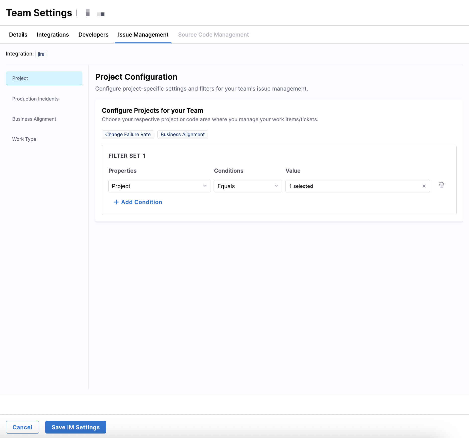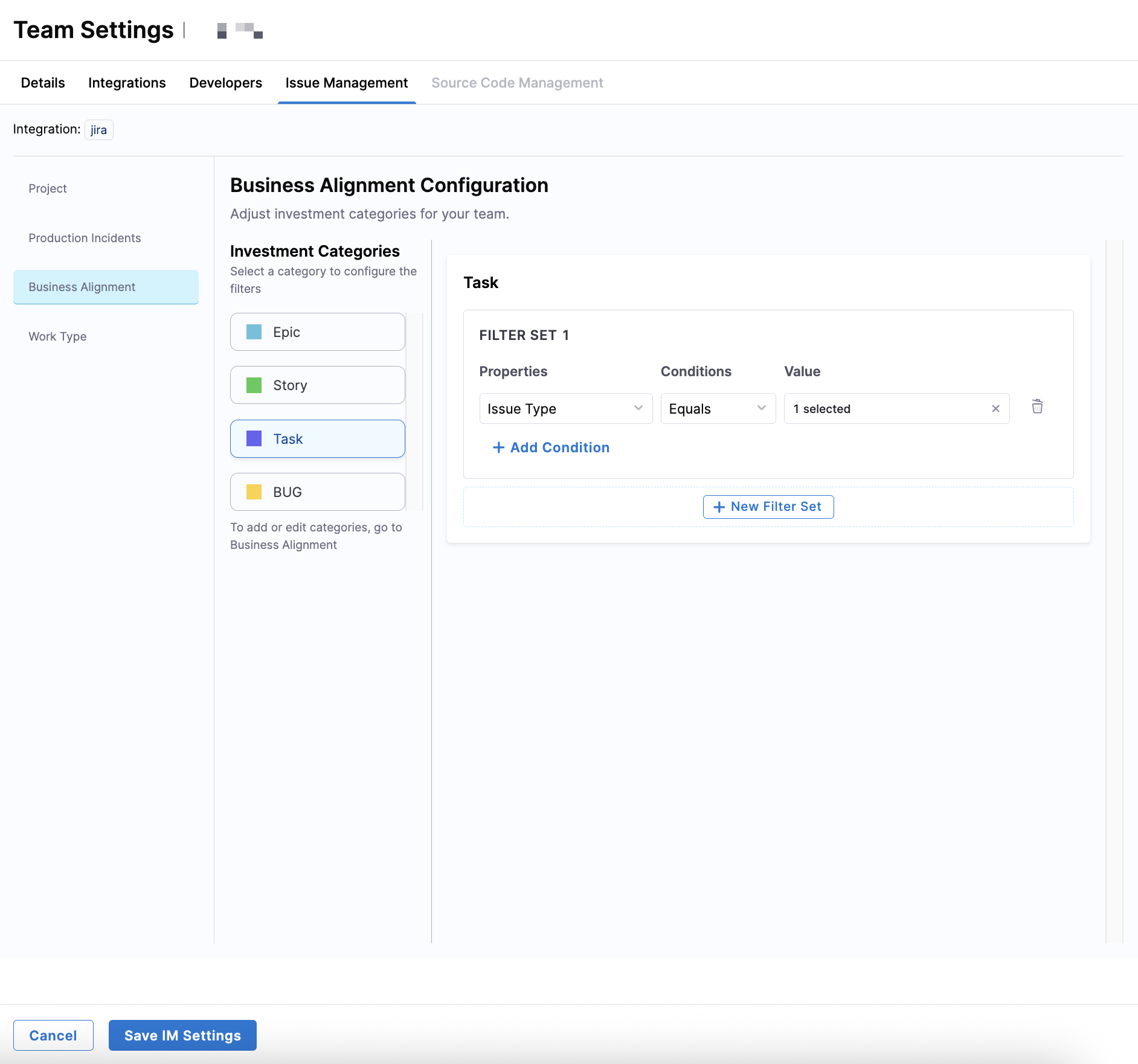 After completing all Issue Management filters, click Save IM Settings to apply the configuration to the team.