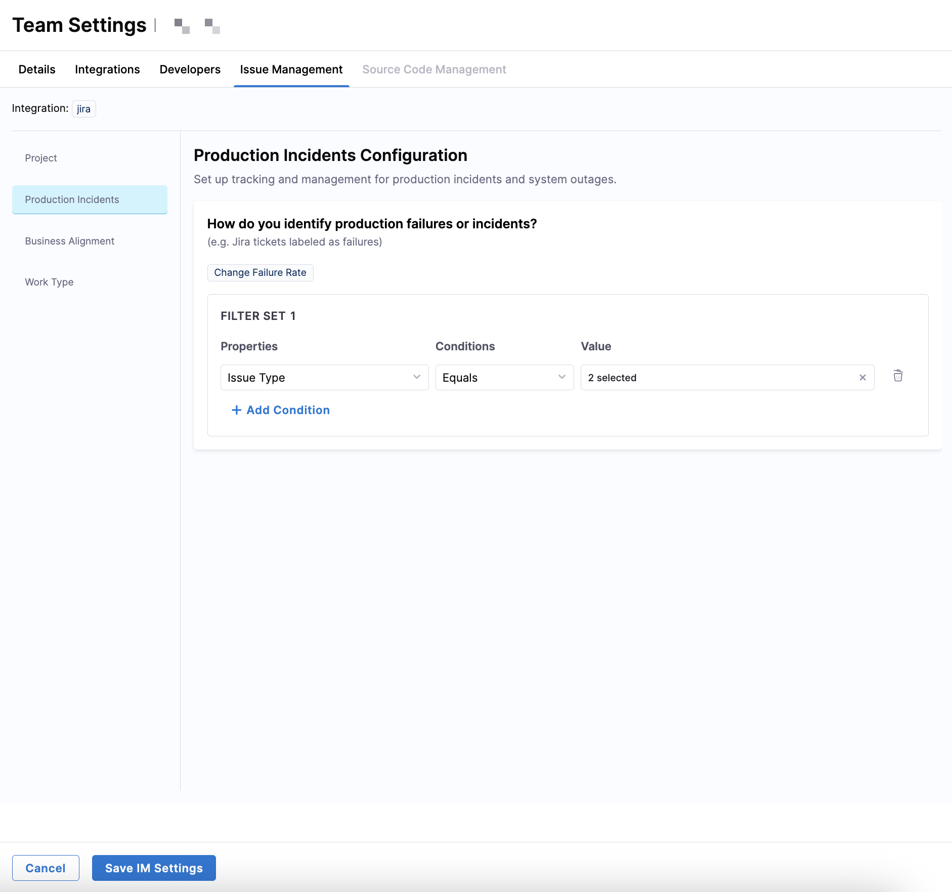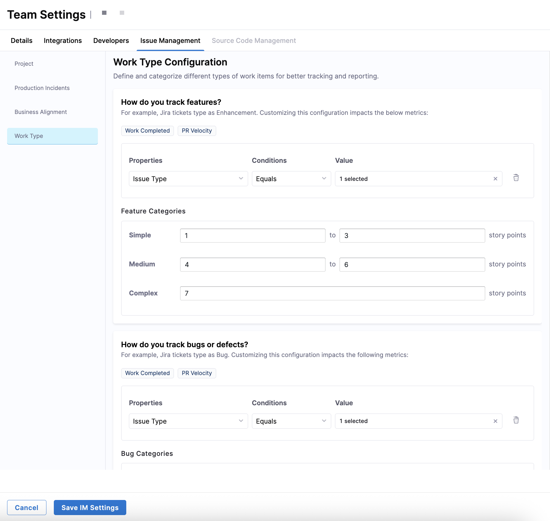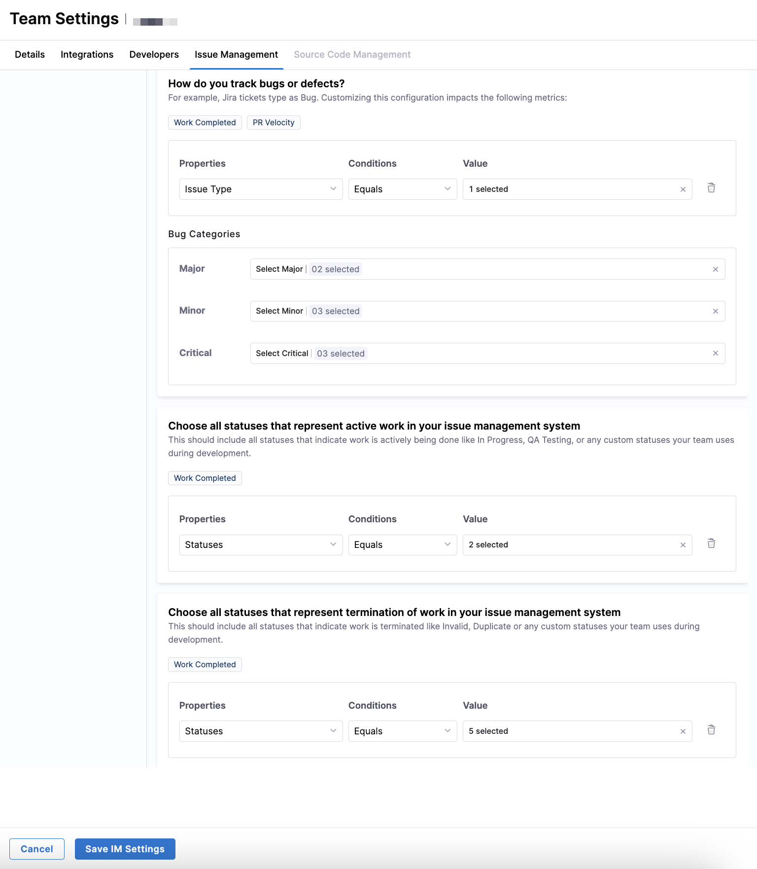 Use the Issue Management tab in Team Settings to define which work items are relevant to your team and how they should be interpreted for metrics calculation. These settings control how SEI 2.0 scopes work, identifies incidents, categorizes investment, and classifies different types of work.